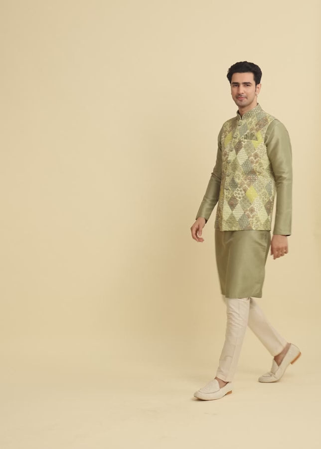 Turn every occasion into a grand celebration with this emerald green kurta jacket set for men, where tradition meets contemporary luxury.