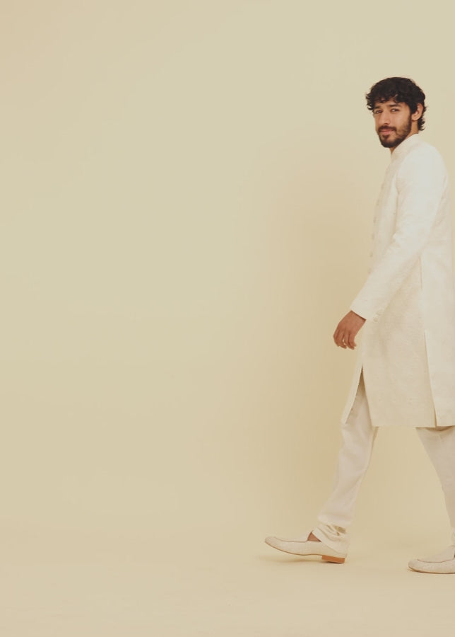 Ideal for weddings, engagement ceremonies, and festive daytime events, this sherwani pairs beautifully with off-white jutis and a chain brooch for a timeless ethnic look.