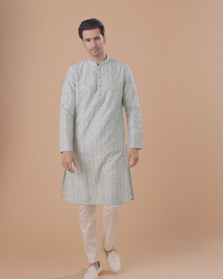 Designed with artistic prints, delicate thread embroidery, and subtle sequin shimmer, the kurta offers a refined festive appeal without being overpowering. Paired with a matching pajama, this ensemble ensures both style and ease of movement. Ideal for weddings, festivals, cultural events, and family gatherings, this kurta pajama set blends traditional charm with modern sophistication.