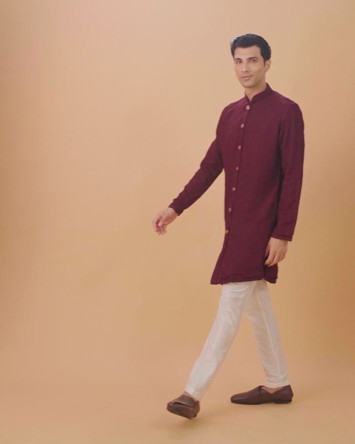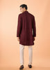 The rich wine colour adds a sultry, refined appeal, while delicate thread embroidery enhances the design with subtle artisanal detailing. Paired with comfortable matching trousers, this ensemble strikes the perfect balance between style and ease. Whether styled for intimate gatherings, festive evenings, or special occasions, this kurta pajama set delivers timeless charm with modern comfort.