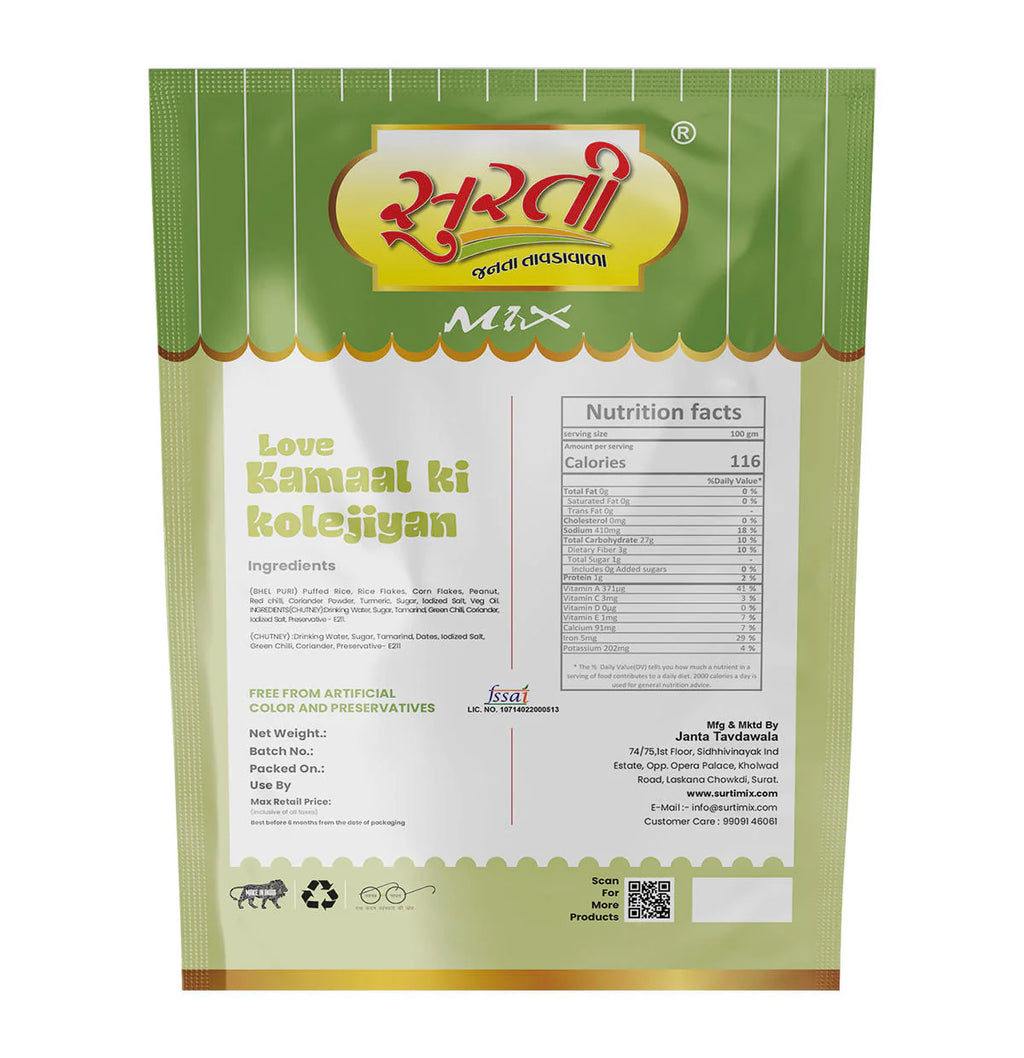 Surtimix Small Kolejiyan Bhel Puri is a delicious mix of crispy puffed rice, zesty chutneys, and bold spices —all without onion or garlic! Perfectly crafted for a flavorful, crunchy experience, it brings you the true taste of Indian street food. Just mix and enjoy!