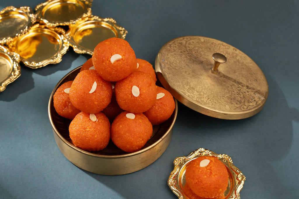 A popular Indian sweet made from tiny gram flour balls, fried and soaked in sugar syrup, then shaped into laddus, known for its soft and crumbly texture.