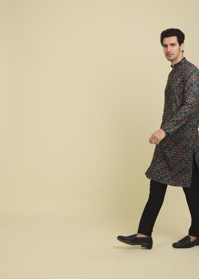 Upgrade your ethnic wardrobe with this Black & Aqua Green Chikankari Grid Print Kurta Set for men, designed to blend classic craftsmanship with contemporary style. Crafted from premium viscose fabric, the kurta features a distinctive grid print inspired by traditional Chikankari embroidery, enhanced with fine embroidery and subtle sequin detailing for a refined festive appeal.