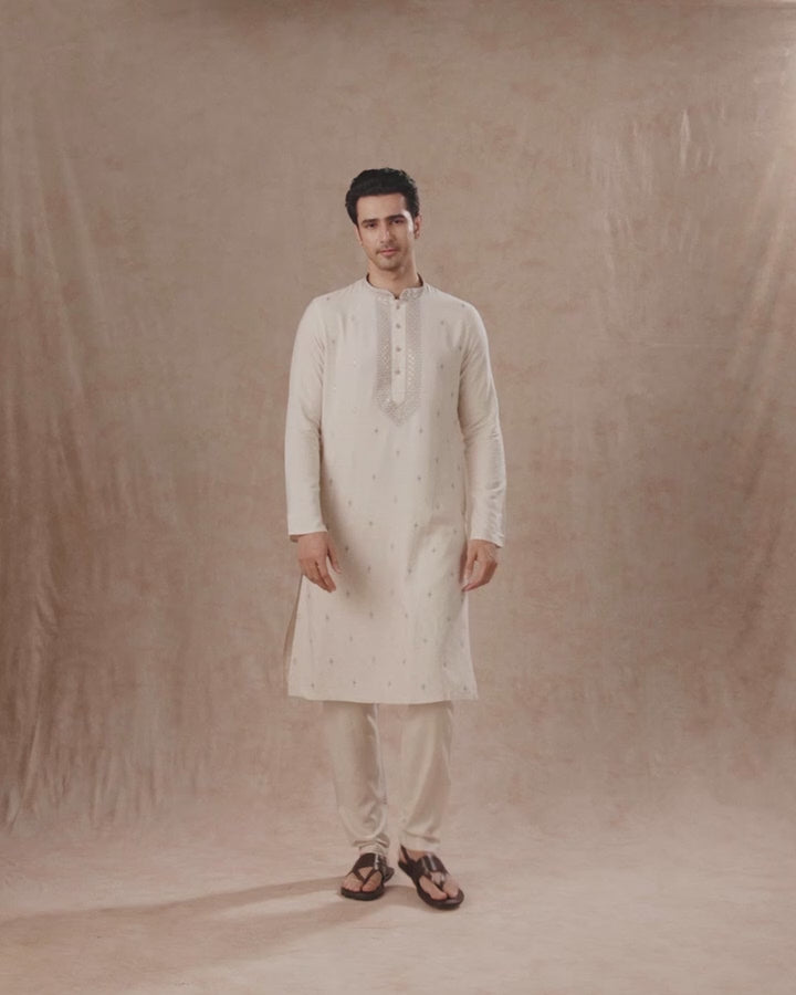 Step into understated sophistication with this Light Grey Elegant Kurta Pajama, crafted for men who appreciate simplicity with refined detail. Made from premium blended linen, this ensemble offers excellent breathability, comfort, and a graceful drape—perfect for long festive hours.
