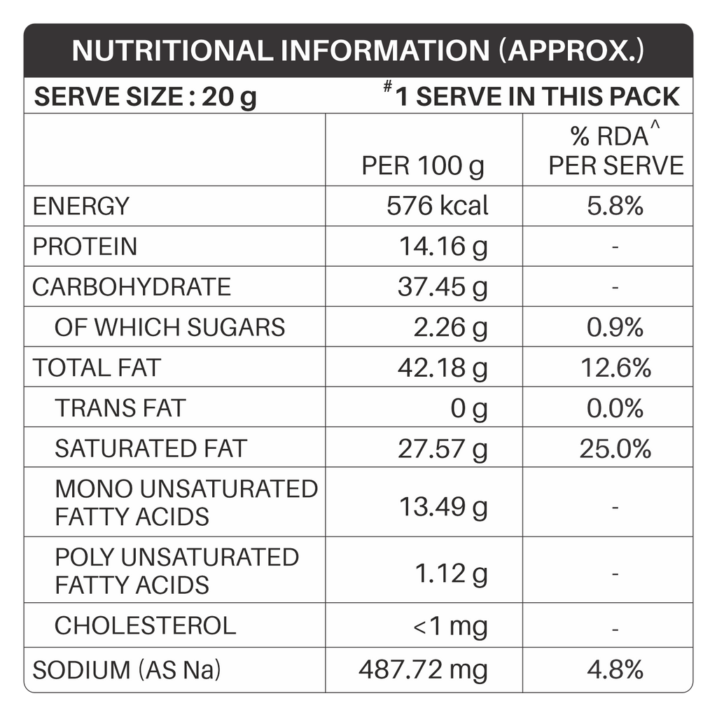 Refined Wheat Flour (Maida) (45%), Edible Vegetable Oil (Palmolein Oil) (27%), Gram Flour (20%), Sugar (5%), Edible Common Salt, Sesame Seeds, Fennel Seeds, Asafoetida, Dry Mango Powder, Spices and Condiments (Chilli Powder, Clove Powder, Black Pepper Powder), and Bicarbonate of Soda (INS 500(ii)).