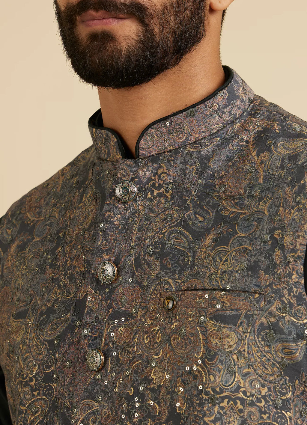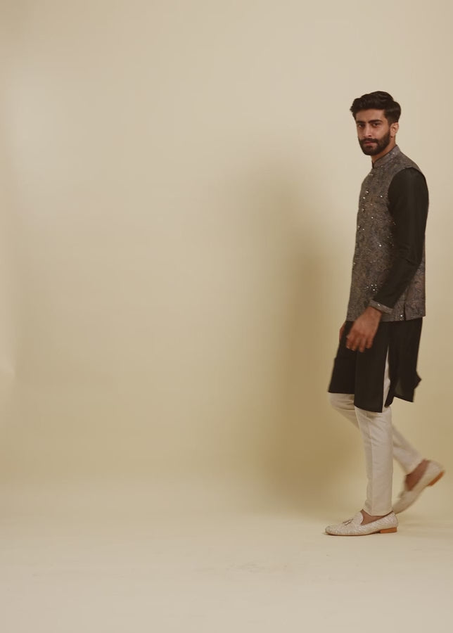 Make a striking style statement with this Bottle Green Floral & Paisley Kurta Jacket Set for Men, designed for those who appreciate refined ethnic fashion. Featuring a rich bottle green hue adorned with elegant floral and paisley printed motifs enhanced by subtle sequins and shimmer work, this ensemble delivers a perfect balance of tradition and modern sophistication.
